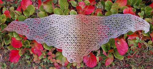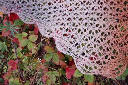 Jatka lisäyksiä op:n krs:lla ennen kaaviota 1. Neulo lisätyillä silmukoilla verkkoneuletta. Ole tarkka, ettet tee ylimääräisiä kavennuksia tai lisäyksiä. Kun huivi on tarpeeksi leveä, ja olet tehnyt kaavion 1 puoliväliin (8 krs) tai loppuun (16 krs) saakka, aloita kavennukset. (Siirrä silmukkamerkki 1 s:n verran vasemmalle eli kaavion 1 ensimmäisen ja toisen silmukan väliin.) Neulo kaavion 1 ensimmäinen silmukka ja sitä edeltävä silmukka oikein yhteen. Kun reunan aina oikein -neuleen silmukoiden ja kaavion 1 välissä on jäljellä 8 s, lopeta verkkoneuleen neulominen ja neulo näillä silmukoilla sileää oikeaa. Kun jäljellä on 7 s, päättele silmukat. Kostuta ja pingota huivi. Levitä lehtikuviot ja kiinnitä yhteen lehteen useita nuppineuloja. Vinkkejä