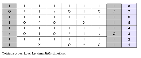 Neulo jatkossa op:n kerroksilla kolme reunasilmukkaa aina oikein -neuletta. Neulo seuraavilla silmukoilla sileää oikeaa kaavioon 1 eli silmukkamerkkiin asti ja lisää 1 s aina ennen kaavion 1 alkua. Neulo np:n kerroksilla ensin lehtikuvio. Neulo lisätyillä silmukoilla nurjaa ja lopuksi kolme reunasilmukkaa aina oikein-neuletta.