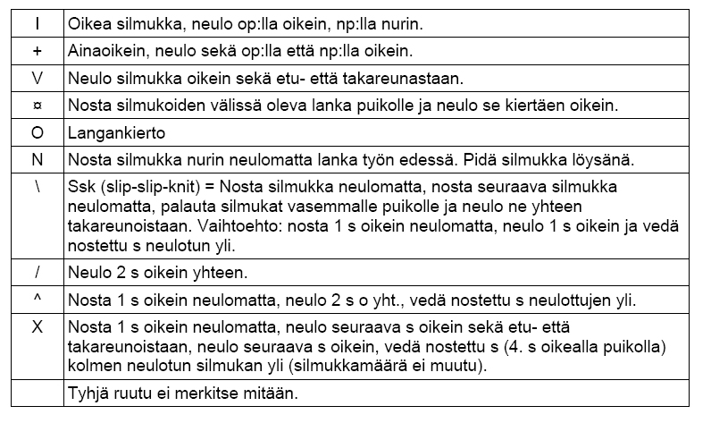 virolainen liukuvärjätty villalanka (100 % villa), 150 g Kapeaan huiviin esim. Novitan Nalle tai Wool, 110 g Neuletiheys Neuletiheydellä ei ole merkitystä, sillä huivin kokoa on helppo muuttaa. Puikot 5 mm tai käsialan mukaan. Käytä 1 - 1,5 mm suurempia puikkoja kuin mitä langalle suositellaan. Muut tarvikkeet 1 tai useampia silmukkamerkkejä (ei pakollinen) Koko Leveän huivin pituus 190 cm, leveys 85 cm OhjeNeulo huivi poikittain pitkän sivun suuntaisesti. Oikealla puolella (op) neulo ensin kolme reunasilmukkaa aina oikein -neuletta, sitten verkkoneuletta kaavion 2 mukaan (aluksi sileää oikeaa, kunnes silmukoita on tarpeeksi verkkoneuletta varten) ja lopuksi lehtikuvio kaavion 1 mukaan. Nurjalla puolella (np) neulo ensin lehtikuvio, sitten verkkoneule ja lopuksi reunasilmukat. Kaavioihin on merkitty kaikki kerrokset. Lue nurjalla puolella kaaviot vasemmalta oikealle. Luo 7 s.