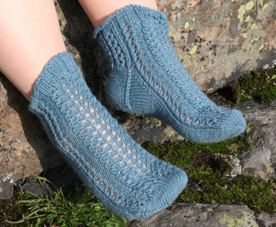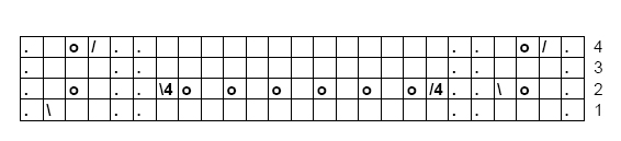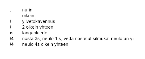 OhjeLuo 16 s 8-aloituksella (ohje Ulla 02/06). Neulo yksi kerros sileää ja jaa silmukat kolmelle puikolle: 4, 4 ja 8 silmukkaa. Jatkossa jalkapöydän silmukat ovat yhdellä puikolla, sillä jalkapöydän keskelle tuleva pitsikuvio on helpoin neuloa näin. Lisää 1. puikon alussa, 2. puikon lopussa ja 3. puikon alussa että lopussa 1 s jokaisella kerroksella, kunnes silmukoita on yhteensä 40. Jatka lisäyksiä joka 2. krs, kunnes puikoilla on 12, 12 ja 24 silmukkaa. Lisää vielä yksi silmukka niin, että silmukoita on 12, 12 ja 25. Jatka jalkapohjan puikoilla sileää ja aloita 3. puikolla jalan päällä mallineule kaavion 1 mukaan. Neulo, kunnes sukan kärki on noin 6 cm lyhyempi kuin jalka. Mallisukassa sukka on noin 14,5 cm pitkä ennen kiilalisäysten alkua. (Jos haluat, vertaa sukkaa valmiiseen sukkaan ja aloita kiilalisäykset samassa kohdassa kuin mallisukassa on aloitettu kavennukset.) Neulo kantapääksi kärjestä aloitettu kiilakantapää (eli ranskalainen kantapää, ohje tässä Ullassa). Koko teräosan pituus on 23 cm. Aloita seuraavalla kerroksella puikoilla 1 ja 2 mallineule kaavion 2 mukaan. Toista mallineuletta molemmilla puikoilla kaksi kertaa. Neulo, kunnes sukan varsi on noin 7 cm pitkä ja aloita joustinneule. Neulo *1 n, 4 o, 1 n* kaksi kertaa, *1 n, 3 o, 1 n* 5 kertaa ja *1 n, 4 o, 1 n* kaksi kertaa. Neulo resoria 12 kerrosta tai kunnes lanka loppuu. Päättele silmukat löyhästi. KaaviotKaavio 1