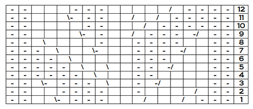 | \ | silmukansiirto vasemmalle: nosta 1. s nurin neulomatta, neulo 1 o, laita vas. puikon kärki nostettuun silmukkaan, päästä oikealta puikolta 2 s, poimi oikein neulottu takaisin, neulo vas. puikolle poimittu s oikein |