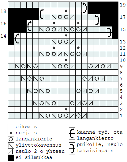 Neulo kaavion jälkeen 2 krs o, 1 krs n, 1 krs o, 1 krs n ja päättele työ nurjaa neuloen.