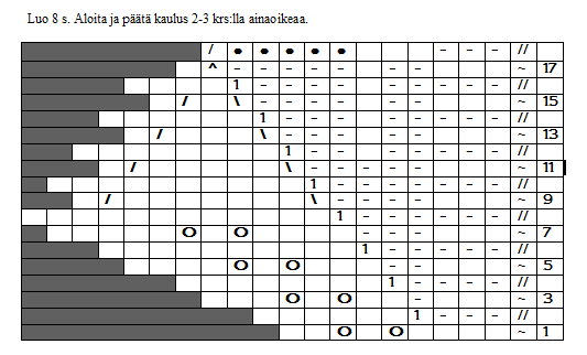 Luo 8 s ja neulo ruutupiirroksen mukaan liittäen kaula-aukon s:t kaulukseen aina nurjan krs:n lopussa. Joka toisella kerroksella liittäminen saattaa venyttää kaula-aukkoa jonkin verran, mutta istuvuus ja sopiva koko ovat tarkistettavissa, kun viimeistelet kauluksen virkkauskerroksella. Huomaa, että kauluksen oikea puoli tulee päällepäin, kun kaulus on taitettu alas. Ole tarkkana, ettei kaulus kiinnity nurin päin! Poimi tarvittaessa silmukoita kaula-aukon reunasta, jottei saumaan jää reikiä.