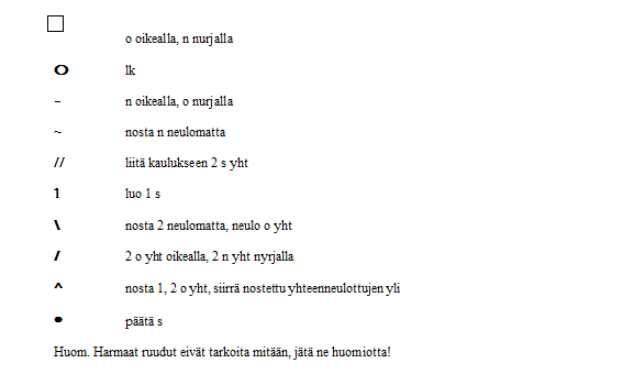 Helmineule: 1 o, 1 n, toista koko krs. Neulo nurjalla oikeat s:t nurin ja nurjat s:t oikein.
