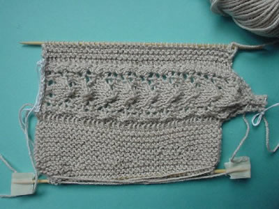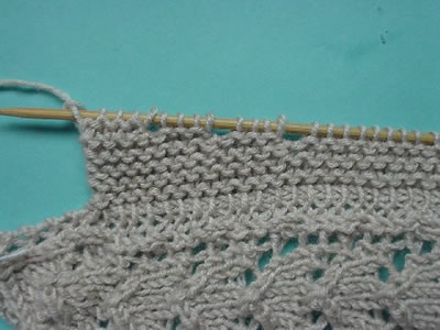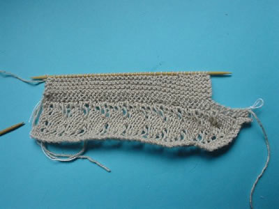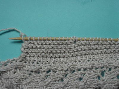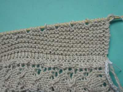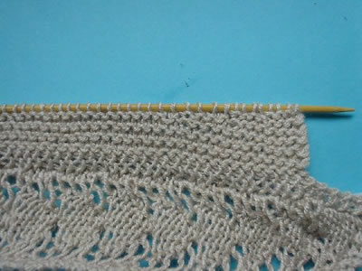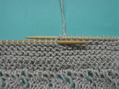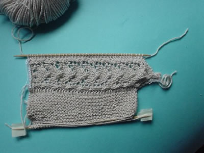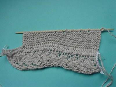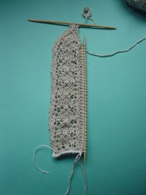 Poimi ranteesta alkaen reunan helmistä 38 s langalla suoraan puikolle. Neulo 6 krs oikein. Seitsemännellä kerroksella neulo 12 o, käännä työ ja palaa takaisin. Neulo 8 o ja palaa takaisin. Neulo 4 o ja palaa takaisin.