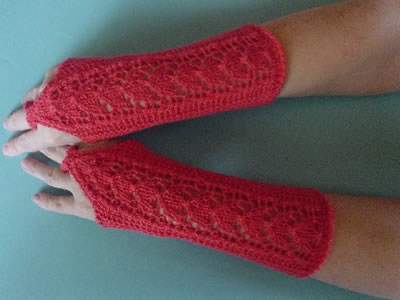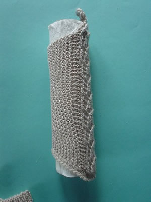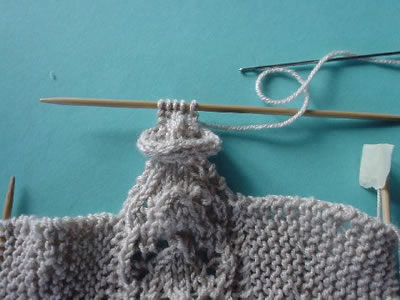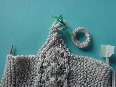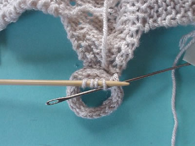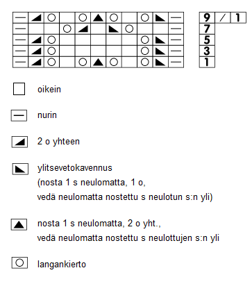 Kymmenes mallikerta: jatka pitsimallia ilman langankiertoja. Kun jäljellä on 5 s, neulo oikealla puolella reunasilmukan jälkeen 1 n, 1 o -joustinneuletta ja nurjalla kaikki nurin yhteensä 5 krs. (= viim. krs. nurin). Ota silmukat apulangalle tai hakaneulalle. Jätä langanpää n. 15 cm pitkäksi, jotta voit ommella sillä "sormuksen" paikoilleen.