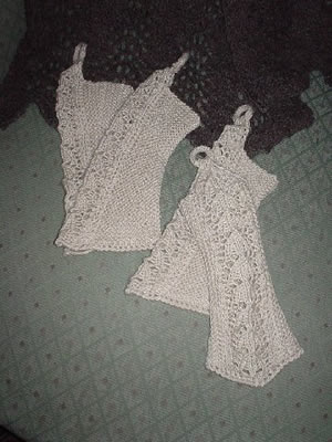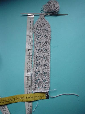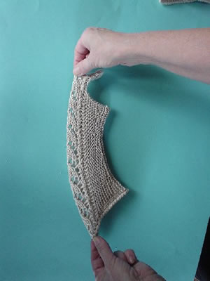 Venytä neule kuvan mukaan kaarelle. Näin työ saa lopullisen muotonsa ja pitsineule muodostaa kauniin kiilan kohti kyynärpäätä.