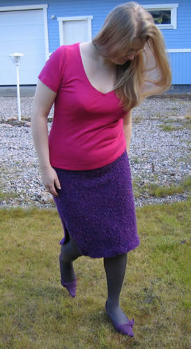 Löysin varastostani paksua, lähes kokonaan tekokuituista bukleetyyppistä vuosikertalankaa. Ostin langan vuosia sitten, koska se oli alennuksessa ja väri oli kiva. Silloin neuloin muutenkin enemmän paksuja lankoja, mutta lanka jäi varastoon ja unohtui sinne. Lankavaraston siivouksen myötä tästäkin langasta piti päästä eroon ja tehdä sille ohje. Minulla oli lankaa vain 300 g, joten mitään kovin isoa siitä ei saanut. Päätin neuloa langasta hameen, koska aikaisemmin olin tehnyt Knittyn Surf & Turf -hameen Novitan Tangosta ja yllättäen siitä tuli ehdoton kesähamesuosikkini. Ehkä siis tästäkin möykkyisestä hieman villaa sisältävästä tekokuituhirvityksestä saisi siis kunnollisen käyttöneuleen.