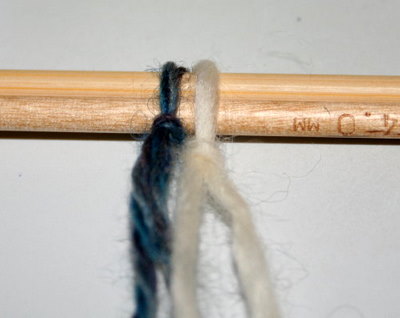 Aloita tekemällä molemmista langoista vetosilmukka puikkojen ympäri.