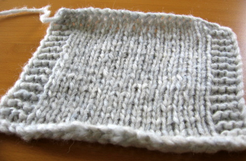 Lanka on lämpimän muhkeaa ja kevyttä. Vaikka suosituspuikot ovat melko paksut (6 - 8 mm), on langan juoksevuus silti yllättävän suuri. 50 gramman kerälle mahtuu noin 130 metriä neulottavaa. Air on helppo neuloa ja se kulkee metallipuikoilla ongelmitta. Neuloin mallitilkun hiukan suositusta pienemmillä, 5,5 mm puikoilla, ja sain tilkun tiheydeksi 14 s ja 21 krs. Tämä tiheys, käytännössä täysin ohjen mukainen, vaikuttaa langalle juuri sopivalta.