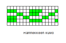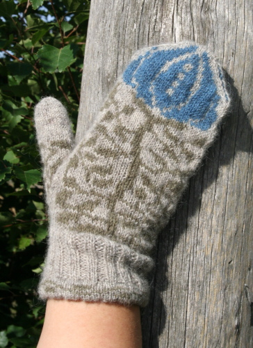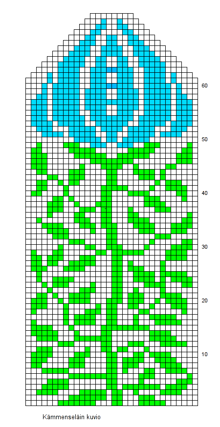 Kun sininen väri tulee mukaan kuvioon, liitä lanka kämmenselän kuvioon ja jätä vihreä lanka pois kämmenselän kuvion jälkeen. Kämmenen kuvioväri vaihtuu siniseksi. Kuviokerroksen 61 jälkeen aloita kärkikavennukset. Neulo 1. puikon alussa ylivetokavennus, 2. puikon lopussa 2 oikein yhteen, 3. puikon alussa ylivetokavennus ja 4. puikon lopussa 2 oikein yhteen jokaisella kerroksella, kunnes jäljellä on 16 s. Silmukoi kärki kiinni harmaalla langalla.
