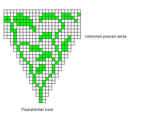 Ota kiilasta odottamaan jätetyt 20 s ja poimi lisäksi peukaloaukon reunasta 4 s kolmelle sukkapuikolle, yhteensä 24 s eli 8 s jokaiselle puikoille. Neulo peukalo ensin kaavion mukaan ja jatka, kunnes peukalon pituus on n. 6 cm tai kunnes peukalon pää lähes peittyy näkyvistä. Kavenna jokaisen puikon alussa 2 s oikein yhteen, kunnes jäljellä on 6 s. Katkaise lanka ja vedä se silmukoiden läpi.