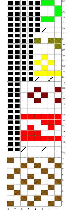 Neulo 5 - 7 - 9 - 11 - 13 krs päävärillä. Aloita sitten kirjoneule ruutupiirroksen 2 mukaan. Kirjoneulekaavioon on merkitty myös kaarrokkeen kavennukset. Neulottuasi kaarrokkeen kirjoneuleosion, työssä on 108 - 114 - 120 - 126 - 132 s. Jatka sileää neuletta päävärillä vielä 2 - 4 - 4 - 6 - 6 krs. Seuraavalla kerroksella kavenna 0 - 6 - 6 - 12 - 12 s tasavälein niin, että kaula-aukkoa varten jää 108 - 108 - 114 - 114 - 120 s. Muotoile seuraavaksi kaula-aukko lyhennetyin kerroksin.