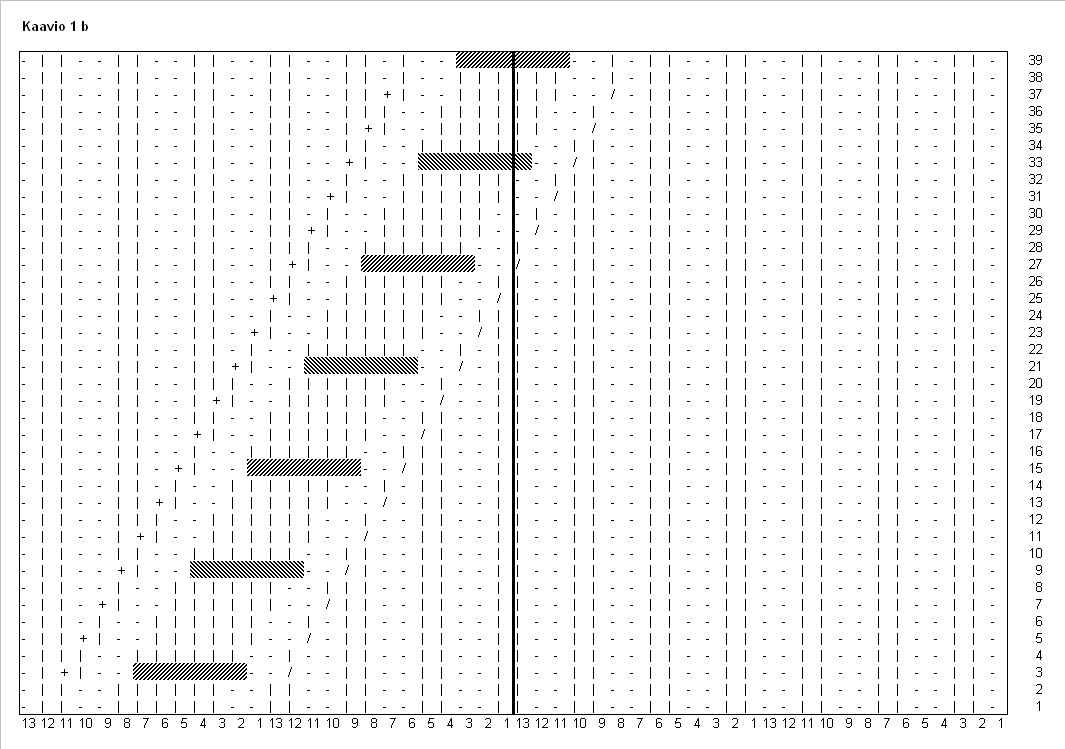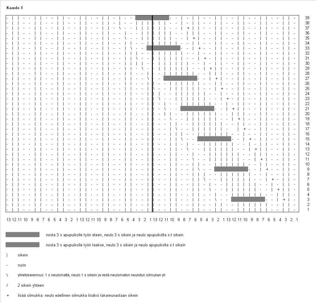 Aloita oikean jalan sukasta. Luo sukkapuikoille 4 x 13 silmukkaa ja aloita neulominen heti kaaviosta 1. Neulo kaavio 1 kokonaan. 39. kerroksen jälkeen neulo vielä 1. puikko 2 o, 2 n -joustinneuletta ja yhdistä silmukat samalla yhdelle puikolle kantalapun neulomista varten. Tällä puikolla on nyt yhteensä 26 silmukkaa.