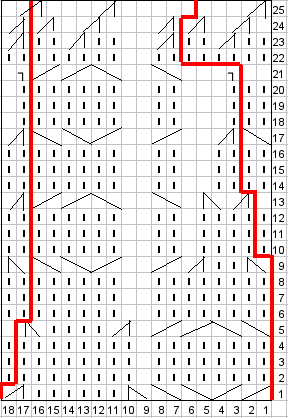 Aloita kavennukset jatkaen mallineuletta ruutupiirroksen 2 mukaan seuraavasti: