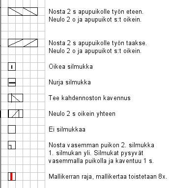 1. krs: *Nosta 2 s apupuikolle työn taakse. Neulo 2 o ja apupuikon s:t o. Nosta 2 s apupuikolle työn eteen. Neulo 2 o ja apupuikon s:t o. Tee kahden noston kavennus, 6 o, 2 s oikein yhteen.* Toista *-* kerroksen loppuun. Työssä on 128 s.
