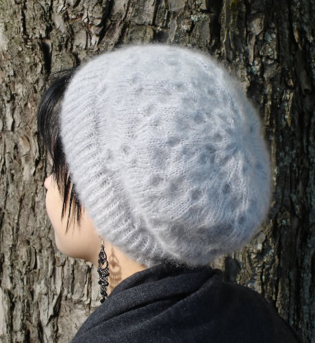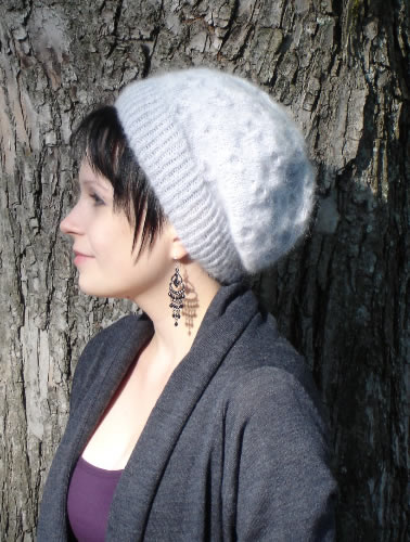 Harmaa myssy: Sublime Kid Mohair Blend (60 % kid mohairia, 35 % nylonia, 5 % merinovillaa; 25 g / 112 m), 50 g vaaleanharmaata (0026).