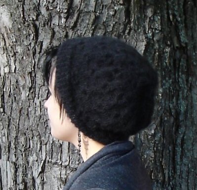 Musta myssy: Drops Kid-Silk (75 % super kid mohairia, 25 % silkkiä; 25 g /200 m), 50 g mustaa (02).