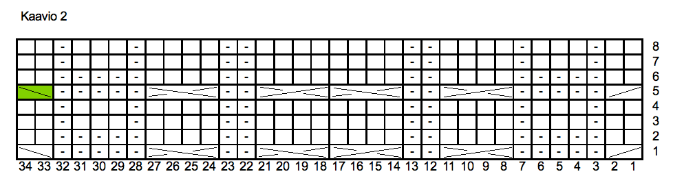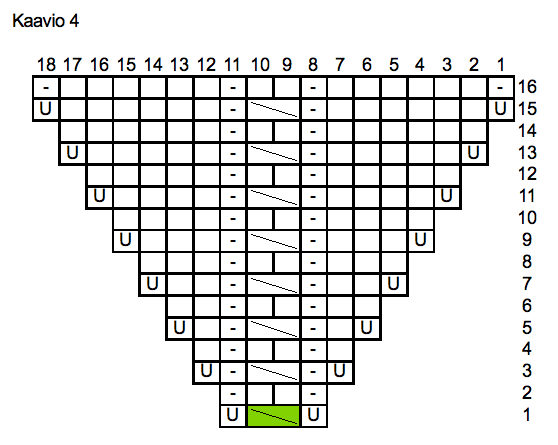 Huom! Kun olet neulonut 5 kerrosta, aloita peukalolisäykset. Lisää kädenselän kuvion viimeisen kahden silmukan (= pikkupalmikko) molemmille puolille 1 silmukka joka toisella kerroksella kaavion 4 mukaan. Peukalokaavion vihreällä merkityt silmukat ovat siis lapasen selkäosan silmukoita. Neulo kaavion kaikki 17 kerrosta.