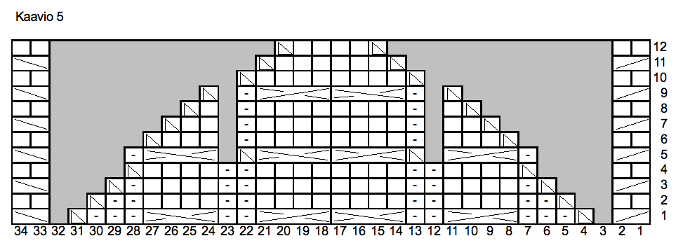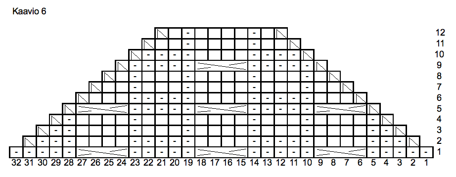 Jatka lapasen neulomista kaavioiden 2 ja 3 mukaan, kunnes olet neulonut 56 kerrosta. Aloita kärkikavennukset kaavioiden 5 ja 6 mukaan. Kavennusten jälkeen työssä on 20 silmukkaa.