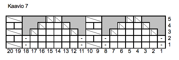 Ota apulangalla odottavat silmukat puikoille. Poimi peukaloaukon reunasta 4 silmukkaa niiden lisäksi. Seuraavalla kerroksella neulo peukaloaukon reunasta poimitut silmukat näin: 2 o yhteen, tee ylivetokavennus. Puikoilla on nyt 20 silmukkaa. Jatka näillä silmukoilla kaavion 7 kerroksia 1–2. Toista nämä yhteensä 8 kertaa. Neulo sen jälkeen kaavion kerrokset 3–5.