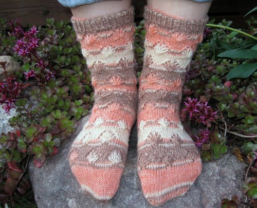 Luo 60 silmukkaa. Jaa silmukat 4 puikolle, 15 silmukkaa jokaiselle. Neulo 1 kiertäen o, 1 n –joustinta 10 krs. Neulo 1 kerros oikein ja aloita neulominen kaavion I mukaan. Jokaiselle puikolle tulee 1,5 kaaviota, ellet halua jakaa silmukoita eri tavalla. Toista kaavio I 2 kertaa. (Jos haluat pitkän varren, toista kaavio I 3 kertaa.)