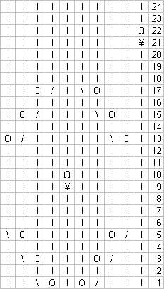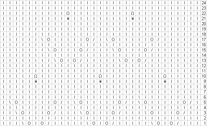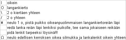 1. krs: Neulo 1. ja 4. puikoilla oikein, 2. ja 3. puikoilla kaavion II mukaan.