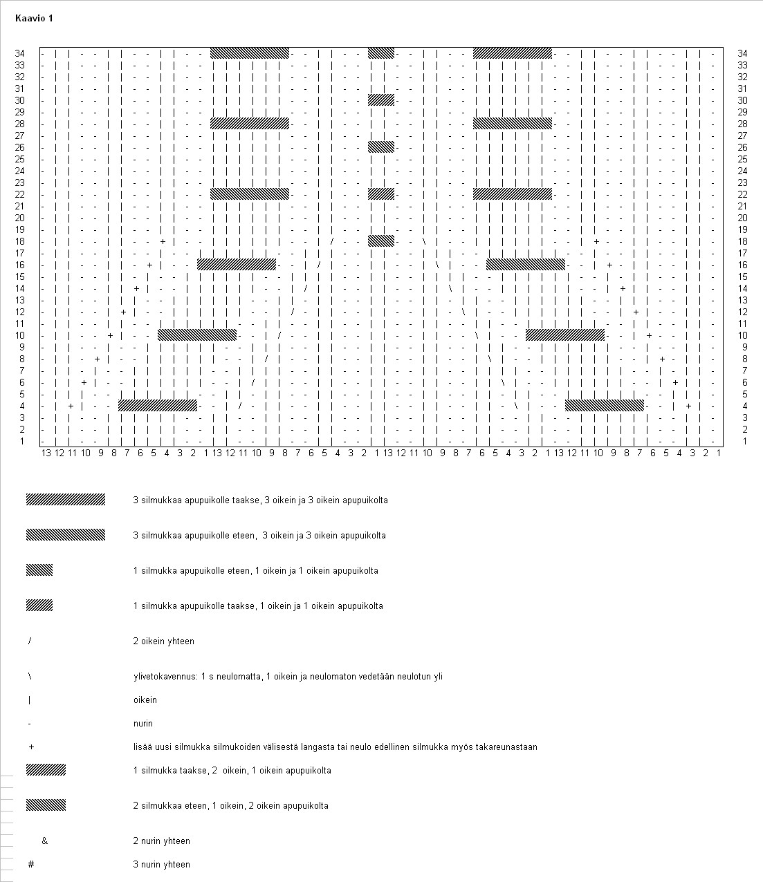 1 nurin neulomatta, 13 nurin, käänny, 1 nurin neulomatta, 12 oikein, 1 oikein takareunastaan, 1 oikein, käänny,