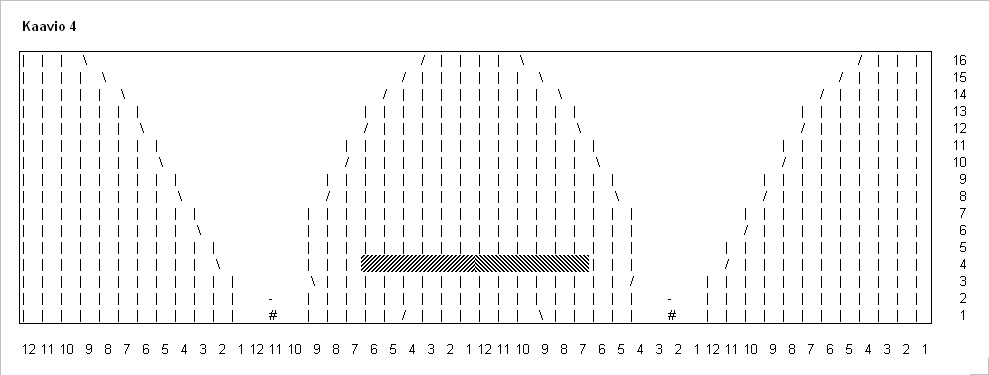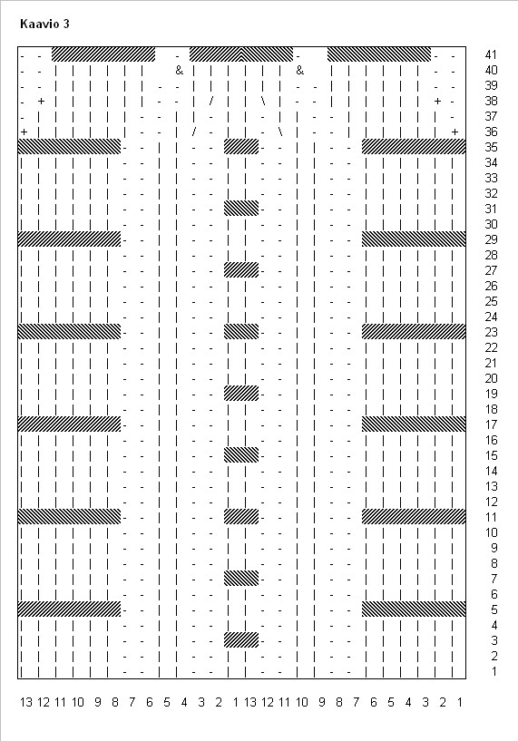 Luo sukkapuikoille 4 x 13 silmukkaa ja yhdistä ne ympyräksi. Aloita neulominen kaaviosta 1 ja seuraa kaaviota oikealta vasemmalle ja alhaalta ylös. Kaavioon on merkitty kaikki kerrokset. Neulo kaavio 1 kokonaan kerroksen vaihtumiskohtaan saakka.