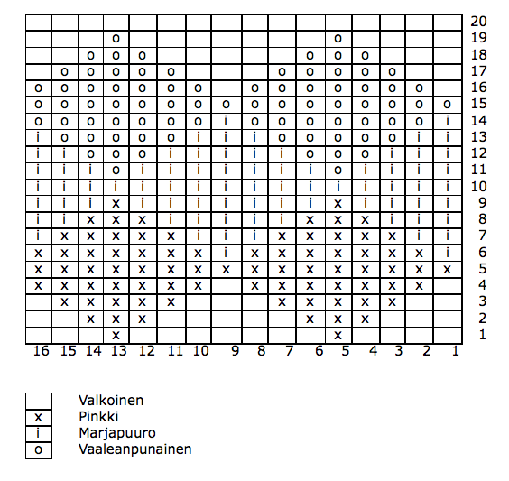 Valkoista kului hieman alle 100 grammaa ja muita värejä muutamia grammoja. Ruutukuvioon ei välttämättä tarvita kokonaisia keriä.