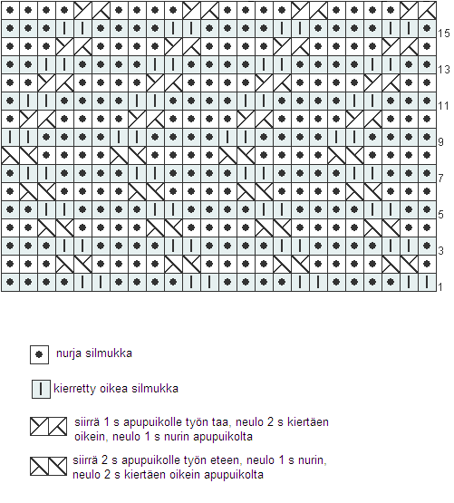 Neulo seuraavalla kerroksella 1. puikko oikein. Neulo 2. puikolla 3 s oikein ja 1 s nurin ja jatka kaavion 1. kerroksen mukaan 2. ja 3. puikolla. Neulo 3. puikon lopussa 1 s nurin ja loput kerroksen silmukat oikein. Jatka näin: toista 2. ja 3. puikolla kaavion kerroksia ja neulo 1. ja 4. puikolla sileää. Kun olet toistanut kaavion 3 kertaa, neulo vielä sen kerrokset 1 - 14.