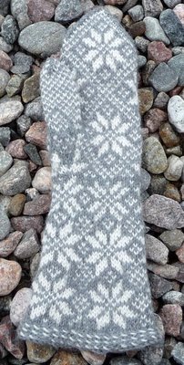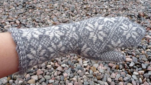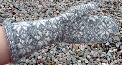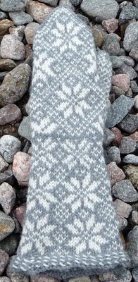 varsiosassa olisi kirjoneuletta, mutta lapasosa olisi yksivärinen. Varsiosasta halusin kellottuvan, rukkasmaisen. Kun aloin