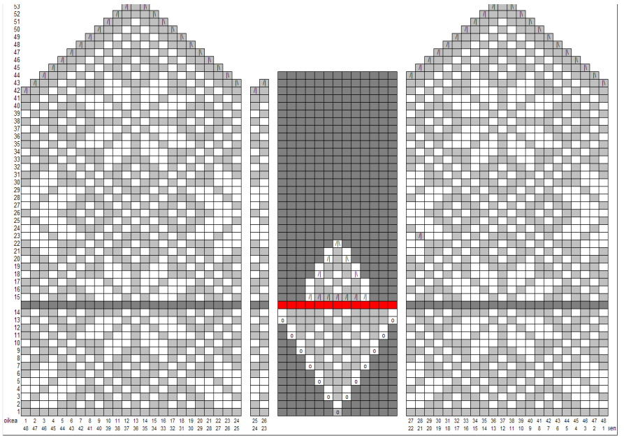 Peukalokiilan punainen kohta neulotaan kerroksella 15. Neulo lapanen kaavion mukaan peukalokiilaan asti. Neulo peukalokiilan silmukat apulangalle (punainen rivi). Siirrä sen jälkeen apulangalla olevat peukalokiilan silmukat takaisin vasemmalle puikolle ja neulo kerroksen 15 peukalokiilan kaavion mukaan (kavennukset). Jatka neulomista kaavion mukaan. Peukalokiilan loput silmukat kavennetaan vähitellen pois.