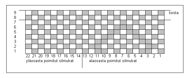 Kärkikavennukset alkavat epäsymmetrisesti, kuten kaaviossa on kuvattu. Ensimmäisellä kavennuskerroksella kavennetaan vain lapasen toisella puolella, sen jälkeen tasaisesti. Näin kavennukset saadaan täsmäämään kuvioon. Kun olet neulonut kaavion loppuun, lapasessa on 6 silmukkaa. Neulo ensimmäinen silmukka, siirrä se vasemmalle puikolle ja nosta muut silmukat neulotun yli. Katkaise lanka, vedä se silmukan läpi ja kiristä.