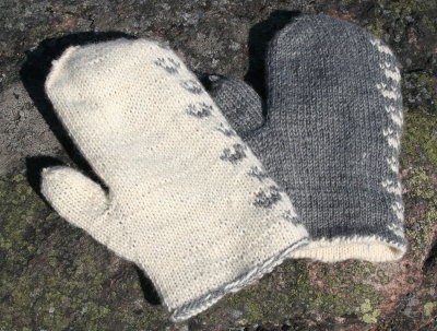 Luo 40 - 48 s ja jaa ne tasan neljälle puikolle. Käytä apuna ohjetta silmukoiden luontiin. Neulo 1. lapasen oikea puoli valkoisella ja sisäpuoli harmaalla. Näin 1. lapasen päälipuolen kuvioväri on harmaa ja sisäpuolen valkoinen.