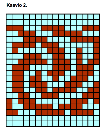 Neulo 4 kerrosta raitavärillä ja 4 kerrosta pohjavärillä. Aloita tämän jälkeen kapeampi kirjoneuleraita (kaavio 1). Jatka sen jälkeen 4 kerroksen raitoja, kunnes jalkaterän pituus on n. 5 cm lyhyempi kuin haluttu jalkaterän pituus ja seuraavaksi neulottava kerros on pohjaväri.