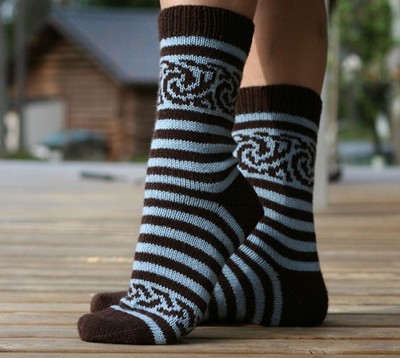 Huomaa, että kirjoneule joustaa vähemmän kuin sileä neulos. Neuletiheyskin saattaa usein sillä kohtaa muuttua. Saadaksesi varmasti sopivat sukat kannattaa mallitilkku tehdä kirjoneuleella.