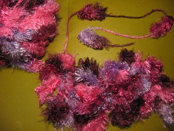 mielenkiintoinen tuttavuus. Langassa on kimaltavia hapsuisia palluratupsuja, jotka ovat kiinni nyörimäisessä