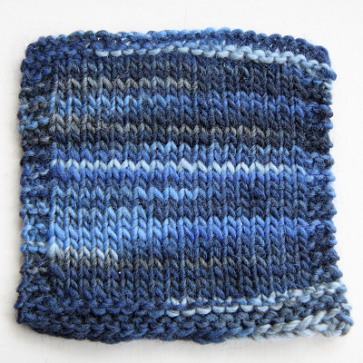 Langassa on neljä sävyä, joista koeneuloin sinikirjavan langan eli sävyn numero 330. Sävy näytti sekä vyyhdillä että neulottuna pintana kauniilta ja sävyt sointuivat hyvin yhteen. Sinisessä värissä on mukana sinisen sävyjen lisäksi myös aavistus harmaata. Lanka on mukavan villaisen tuntuista ja siitä oli helppo neuloa tasaista pintaa, joka vielä tasoittui pesussa. Lanka on yksisäikeinen ja siksi hieman pörröinen, mutta se ei halkeillut neulottaessa. Langan saa varmasti varomattomalla pesulla helposti vanuttumaan. Lanka ei päästänyt väriä pesussa ja mallitilkku piti pesussa myös hyvin muotonsa. Tiheys muuttui löyhemmäksi eli kuudestatoista silmukasta kymmenellä sentillä viiteentoista silmukkaan. Kerrosmäärä ei muuttunut