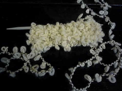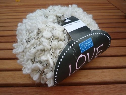 Marks & Kattensin uutuuslanka Love on efektilanka, joka muodostuu löyhäkierteisestä pohjalangasta, joka on kurottu lenkeille toisella, ohuella lankasäikeellä. Testikerässä pohjalanka on valkoinen ja toinen säie kontrastoiva musta.