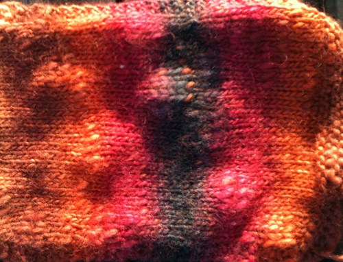 Natur Uld Flamme on pehmeää, puhdasta villaa. Lanka on yksisäikeinen ja sen paksuus vaihtelee todella paljon. Yksisäikeisyys tekee pinnasta hyvin pehmeän ja pörröisen. On siis hyvin mahdollista, että valmiin neuleen pinta nyppyyntyy helposti. Langan väri vaihtelee pitkinä jaksoina niin, että neuleeseen muodostuu raitoja, jos silmukoita on vähän. Värit olivat lämpimiä ja maanläheisiä ja niistä tuli lähinnä syksyinen vaikutelma. Ohuet ja paksut kohdat näkyvät selvästi valmiissa neuleessa ja paksut kohdat muodostavt möykkyjä neuleen pintaan. Minun mielestäni paksuusvaihtelu toimisi paremmin joko yksivärisessä tai lähisävyin värjätyssä langassa, nyt neulos näyttää sekavalta.
