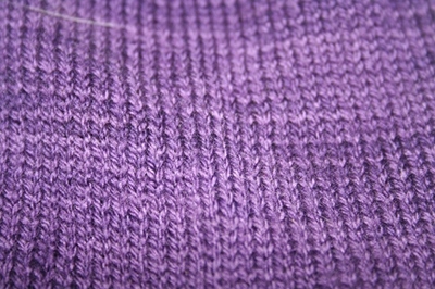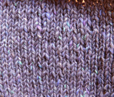 Lanka on epätasaista, löyhäkierteistä ja hieman huopuneen oloista. Jos kuvittelet mielessäsi kahta hieman huovutettua, löyhäkierteistä hahtuvalankaa kiedottuna toistensa ympärille pääset aika lähelle Donegal Luxury Tweed Aranin rakennetta. Epätasaisuuden lisäksi langasta löytyy myös eri värisiä nyppyjä, jotka tekevät neulepinnasta elävän. Testissä olleen langan väri (360005) tuo mieleen lähinnä marjapuuron tai kanervan. Pilkut ovat eri sävyisiä punaisia ja violetteja nyppyjä ja mukana on myös kirkasta vaaleanvihreää villaa. Sävyt ovat kauniita murrettuja ja sopivat pääosin toisiinsa, pieni määrä vihreää tuo mukaan hieman pirteyttä.