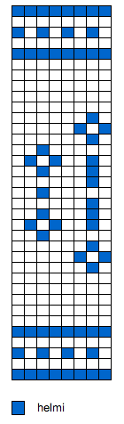 Luo 64 s ja jaa silmukat tasan neljälle sukkapuikolle. Neulo 2 o 2 n -joustinta 8 krs. Neulo sitten sileää 4 krs, joista viimeinen löysästi lisättävien helmien vuoksi. Aloita helmien lisääminen neuleeseen kaavion mukaan. Helmien neulomiseen virkkuukoukun avulla on ohje numerossa 03/07. Neulo täysiä helmikerroksia edeltävä kerros aina löysemmin, sillä helmet kiristävät neulosta.