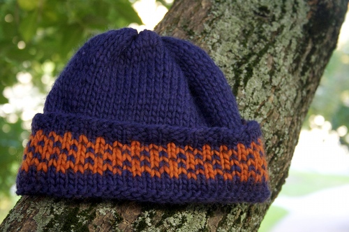 neulottu paksusta villalangasta ja siinä on korvia lämmittämässä taitteen lisäksi kirjoneuletta.