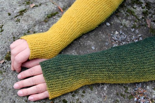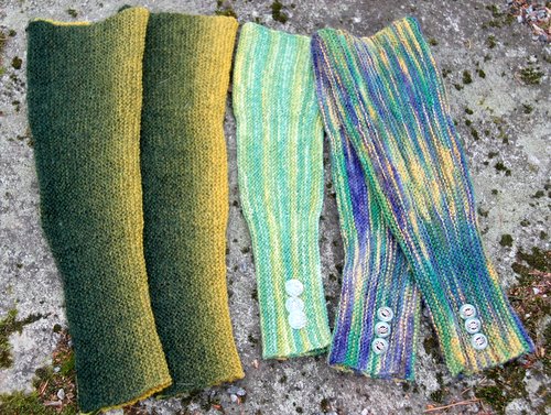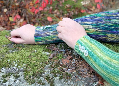 Kuvissa olevat peukaloaukolliset hihat ovat Helvi Toivolan neulomat, ja niissä on käytetty liukuvärjättyä vironvillaa. Kelta-lila-vihreäkirjavat ovat Ilun Tähtilampun alla -värisestä norjalaisesta villalangasta ja vihreäkirjavat Austermann Stepistä. Ohjetta on koeneulottu myös mm. Regian 4-säikeisestä.