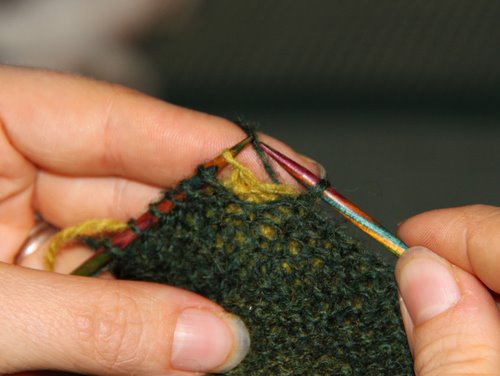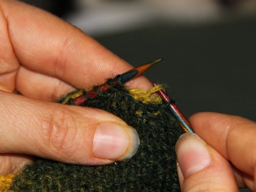 Neulo vielä 3 kerrosta aina oikein. Viidennellä kerroksella neulo vain 60 s ja käännä työ. Nosta 1. s n ja muljauta se kireäksi kuten tiimalasikantapäätä tehdessä (ks. Tiimalasikantapään ohje). Neulo loput 59 s normaalisti oikein. [Tässä kohdassa ensimmäisessä hihassa on kaksi kerrosta enemmän kuin toisessa, mutta tilanne tasaantuu seuraavien kerrosten jälkeen.]