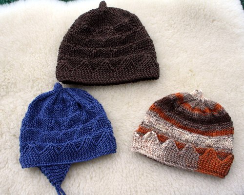 Jos haluat tehdä pipoon myös korvaläpät, neulo ne lopuksi. Kuvassa sinisessä pipossa on korvaläpät, muissa ei.