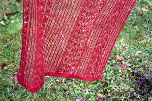 Voit toistaa mallineuleita haluamasi määrän. Neulo, kunnes huivi on sopivan mittainen. Lopeta siten, että osat 4 (Varjolehtiköynnös) ja 6 (Lehdet) on neulottu loppuun. Neulo viimeiseksi oikea kerros.