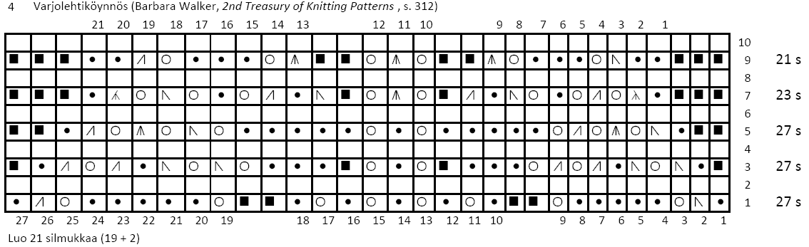 | 4 | Varjolehtiköynnös | 21 | 1. krs: 27 s 3. krs: 27 s 5. krs: 27 s 7. krs: 23 s 9. krs: 21 s |