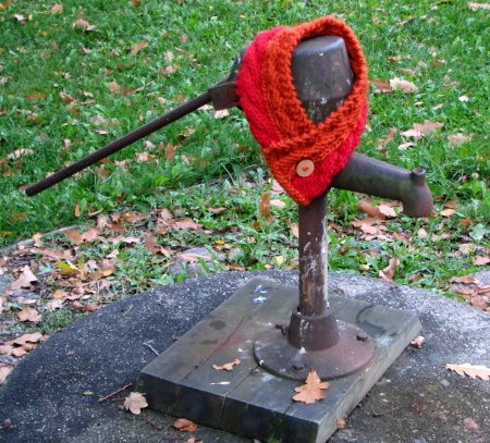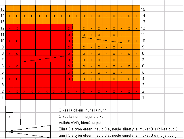 Neulo mallineuleen mukaan kerrokset 1-3 punaisella. Neulo mallineuleen kerrokset 4-5 ja vaihda väriä aina kerroksen keskellä siten, että langat kiertyvät. Jatka mallineuleen mukaan kerrokset 6-11. Toista kerroksia 6-11 noin 15 kertaa. Viimeisen toiston aikana jätä langat kiertämättä kerroksilla 8 ja 9, jolloin keskelle syntyy napinläpi. Neulo mallineuleen mukaan kerros 12 edelleen kahdella värillä. Neulo mallineuleen mukaan kerrokset 13-15 oranssilla. Päättele silmukat.